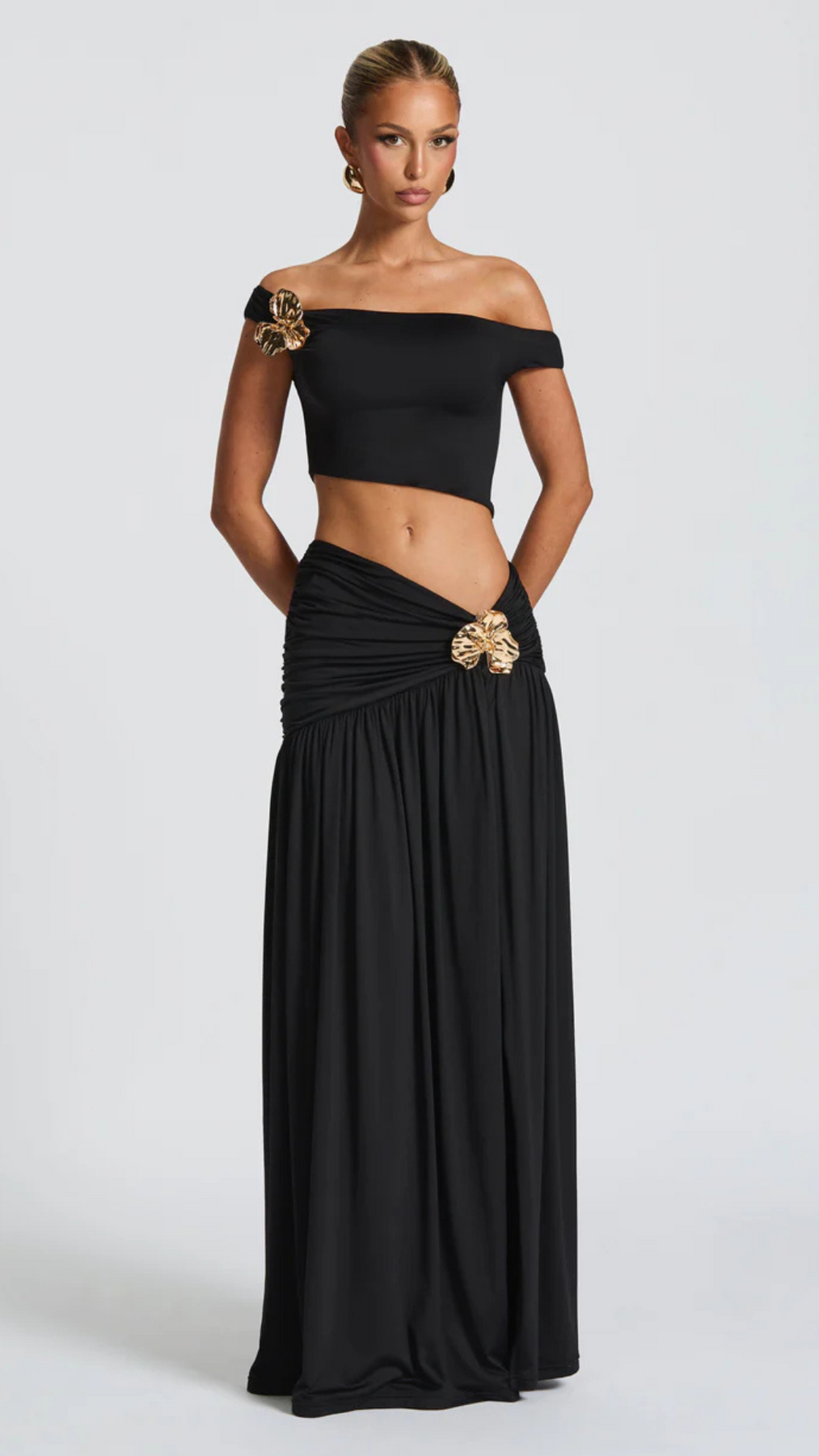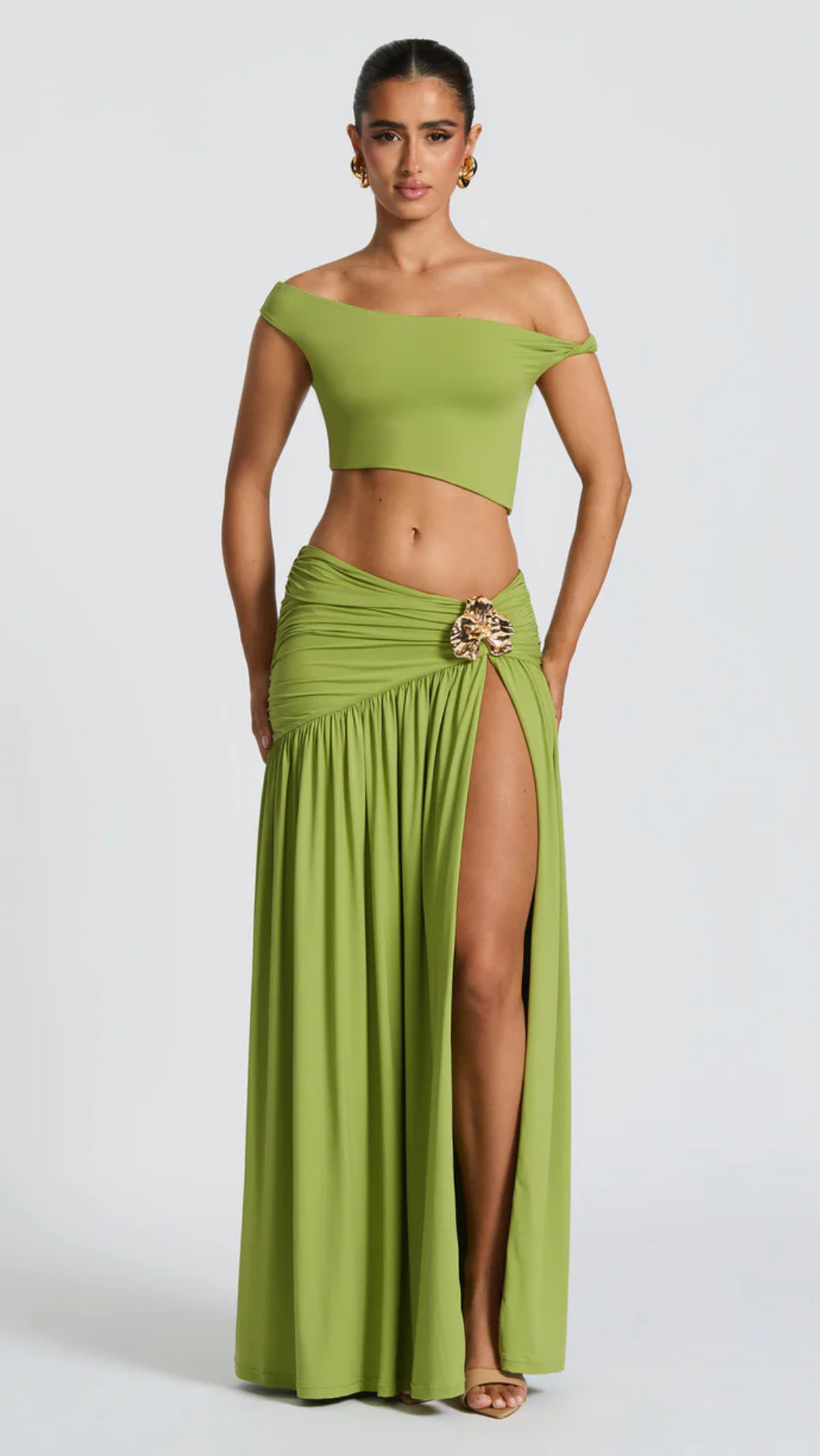 Wees een echte eyecatcher in onze Eva Set in Magenta. Deze set bestaat uit een maxi rok én bijpassende top. De rok is gemaakt van zachte mesh en heeft een flatterend, gerimpeld heupdetail met een flirterige split. De top is stijlvol afgewerkt en vormt samen met de rok een elegante, vrouwelijke look. De afneembare broche maakt het helemaal af.